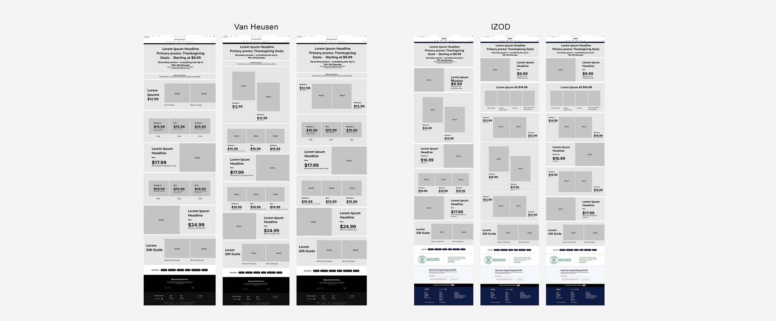 After various rounds of team collaborations and iterations, final designs were completed for Van Heusen and IZOD. By building upon current existing modules, I was able to have the flexibility of designing more robust wireframes to meet our business needs. While also keeping in mind the different brand identities, both homepages have similar, but slight differences to their designs. Similar modules were incorporated into both brands to help ease development during our holiday timeline. Compelling visuals and prominent price-point callouts were created to captivate our consumers and expand customer loyalty.