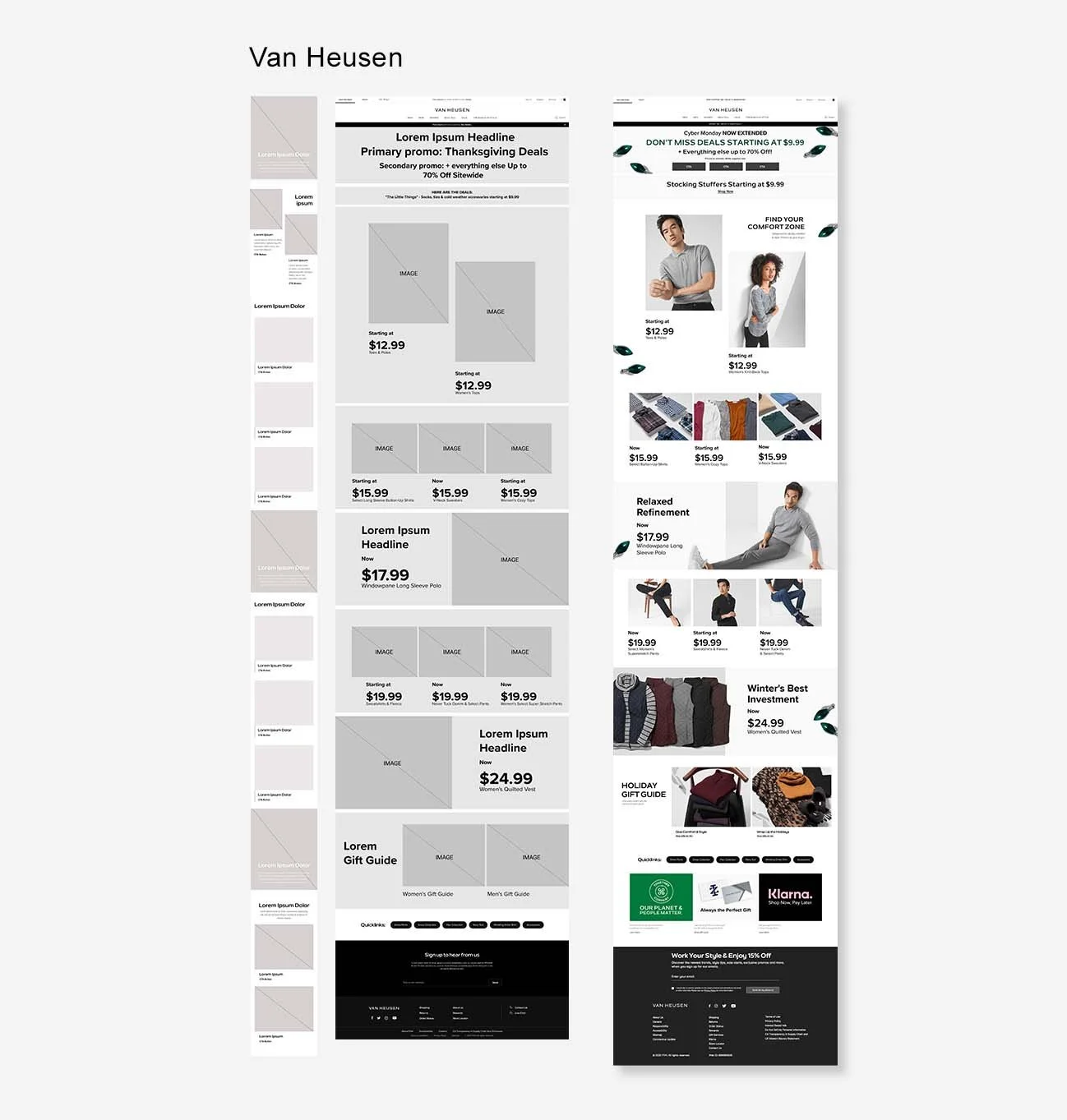 Brainstorming sessions were held with our digital, creative, copywriting, development, and marketing teams. My focus was to do a comparative analysis from our previous holiday webpage design between Van Heusen and IZOD websites. From the learnings, I was able to isolate the same and similar modules used to create both sites seasonal promotions for the homepages. Next steps in the redesign process was to figure out how to build upon our current modules while also adding new ones to fulfill marketing ask of displaying price-point callouts and showcasing more product. One of the challenges I had while redesigning was keeping in mind that these are two very different brand identities, but also trying to find common modules and components that can work across both brands.