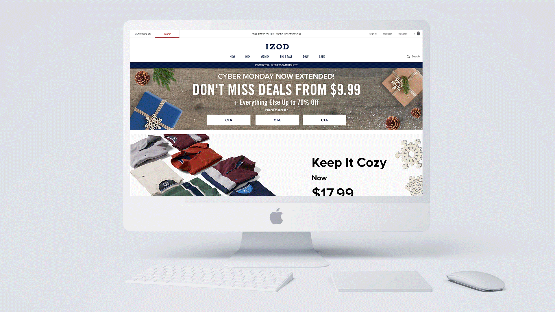 Create a visually pleasing and easy to navigate shopping experience on Van Heusen and IZODs homepages during our heavy promotional events. Build a homepage site that will represent each brands identities, while keeping in mind the user and business needs.